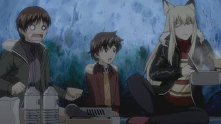 During the feast, Kugen tries to convince Gyokuyou that being a pet at home is better than a wandering animal on the street. (Gyokuyou's still wearing his/her mini-skirt kimono in mid-winter...)